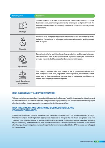 RISK ASSESSMENT AND PRIORITISATIONValeura evaluates risks based on their potential impact on the Company%u2019s ability to achieve its objectives, and on their likelihood of occurence. Risks are categorised as: high (exceeding risk tolerance and demanding urgent attention), medium (requiring ongoing management and vigilance), and low. RISK TREATMENT AND ENHANCING BUSINESS RESILIENCE FROM OPPORTUNITIESValeura has established systems, processes, and measures to manage risks. For those categorised as %u201chigh%u201d, the Risk Champion must implement appropriate measures to mitigate the risk to an acceptable level. For %u201cmedium%u201d risk, the Risk Owner is also required to reduce the risk through appropriate measures, including regular monitoring. Risks identified as %u201clow%u201d require monitoring to identify early warning indicators. If risks remain after having put such mitigations in place, the particular item remains subject to the ERM process, and is flagged as a residual risk. Risk categories DescriptionStrategicStrategic risks include risks in human capital development to support future business needs, addressing sustainability challenges and global trends for long-term value creation, and meeting stakeholder, community, and regulatory expectations.FinancialFinancial risks comprise those related to financial loss or economic shifts, including fluctuations in oil prices, rising operating costs, and increased cost of capital.OperationalOperational risks for activities like drilling, production and transportation can be from hazards such as equipment failure, logistical challenges, human error or major incidents that have social and environmental impacts. Legal, Compliance & ReputationThis category includes risks from change of law or government policies, and non-compliance with laws, regulation, internal policies, or contracts, which could lead to fines, reputational damage, loss of stakeholder confidence, or impact the Company%u2019s licence to operate.VALEURA ENERGY INC. 101