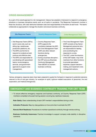 CRISIS MANAGEMENTAs a part of its overall approach to risk management, Valeura has adopted a framework to respond to emergency situations or business disruptive events such as oil spills or accidents. The Response Framework involves a three-tier structure, with clear distinction between roles and responsibilities of the teams at each level. The teams collaborate as appropriate to manage the situation and ensure business continuity.%u2022 Country Response Team (CRT) supports the coordiation between the SRT, the Crisis Management Team (CMT) and other relevant functions during emergencies.%u2022 During a business disruption, the CRT acts as a Business Continuity Management Team (BCMT) to maintain business continuity.%u2022 The Crisis Management Team (CMT) consists of key Senior Management personnel who are responsible for leading and coordinating the response to a crisis. %u2022 The CMT, under the direction of the CMT leader, may invite members from other functions to provide specialised expertise, support decisionmaking, and implement crisis management actions.%u2022 Site Response Teams (SRTs) exist in every site, such as dilling rigs, warehouses, production platforms, etc.%u2022 The SRTs are the first to respond to incidents at both onshore and offshore sites.%u2022 The SRTs are responsible for coordinating with specialised teams, local emergency services, and government agencies to support crisis management.Site Response Teams Country Response Team Crisis Management TeamVarious emergency response plans have been prepared to guide the Company%u2019s response to potential scenarios relevant to the oil and gas industry, for example oil spills, typhoon-related evacuation of personnel, fire and exploration, and medical emergencies. EMERGENCY AND BUSINESS CONTINUITY TRAINING FOR CRT TEAM%u2022 To ensure effective emergency response and business continuity, all Country Response Team (CRT) members completed a focused training session covering key readiness measures: Role Clarity: Clear understanding of each CRT member%u2019s responsibilities during a crisis. Activation Protocols: Step-by-step guidance on how and when to activate the CRT. Remote Work Readiness: Procedures to maintain operational continuity through remote working. Business Continuity Awareness: Practical knowledge to support company-wide stability in disruptive scenarios. VALEURA ENERGY INC. 103