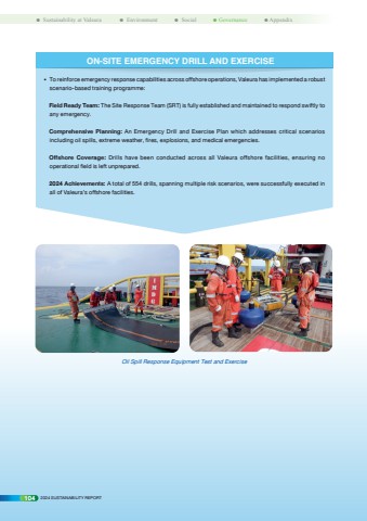 Oil Spill Response Equipment Test and ExerciseON-SITE EMERGENCY DRILL AND EXERCISE%u2022 To reinforce emergency response capabilities across offshore operations, Valeura has implemented a robust scenario-based training programme: Field Ready Team: The Site Response Team (SRT) is fully established and maintained to respond swiftly to any emergency. Comprehensive Planning: An Emergency Drill and Exercise Plan which addresses critical scenarios including oil spills, extreme weather, fires, explosions, and medical emergencies. Offshore Coverage: Drills have been conducted across all Valeura offshore facilities, ensuring no operational field is left unprepared. 2024 Achievements: A total of 554 drills, spanning multiple risk scenarios, were successfully executed in all of Valeura%u2019s offshore facilities. 104 2024 SUSTAINABILITY REPORT%uf098 Sustainability at Valeura %uf098 Environment %uf098 Social %uf098 Governance %uf098 Appendix