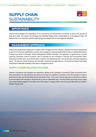 SUPPLY CHAIN SUSTAINABILITYMANAGEMENT APPROACHIMPORTANCEValeura acknowledges the importance of its contracting and procurement practices as part of the pursuit of long-term value. As a result, the Company has identified Supply Chain Sustainability as a key Material Topic and believes this is an area that warrants ongoing rigorous assessment and management attention. Valeura has established an approach to supply chain management that includes a Supplier/Contractor Assessment as part of a formal pre-qualification process, and manages its ongoing relationships by way of a defined Evaluation Process and series of Supplier Quality Management (SQM) meetings. This approach is governed by a broad reaching Contractor Code of Conduct, and is overseen by the Company%u2019s Contract and Procurement Team (including contract team, procurement team, customs and expediting team, and warehouse and base operations team). All relevant critical decisions are ultimately reviewed and approved by a Procurement Board Committee comprised of selected members of the senior management team.SUPPLY CHAIN-RELATED POLICIESValeura%u2019s contractors and suppliers are required to adhere to the Company%u2019s Contractor Code of Conduct which sets expectations for high operating standards and makes for mandatory compliance with the Company%u2019s Code of Business Conduct and Health Safety and Sustainability Policy. In this way, Valeura requires its contractors to adhere to environmental and regulatory requirements as well as applicable laws, including those governing human rights such as the Fighting Against Force Labour and Child Labour in Supply Chains Act (commonly referred to as Canada%u2019s Modern Slavery Act). 106 2024 SUSTAINABILITY REPORT%uf098 Sustainability at Valeura %uf098 Environment %uf098 Social %uf098 Governance %uf098 Appendix