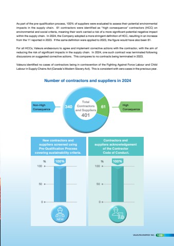Number of contractors and suppliers in 2024Total Contractors and Suppliers401340 61 Non-High ConsequenceHigh ConsequenceAs part of the pre-qualification process, 100% of suppliers were evaluated to assess their potential environmental impacts in the supply chain. 61 contractors were identified as %u201chigh consequence%u201d contractors (HCC) on environmental and social criteria, meaning their work carried a risk of a more significant potential negative impact within the supply chain. In 2024, the Company adopted a more stringent definition of HCC, resulting in an increase from the 11 reported in 2023. If the same definition were applied to 2023, the figure would have also been 61.For all HCCs, Valeura endeavours to agree and implement corrective actions with the contractor, with the aim of reducing the risk of significant impacts in the supply chain. In 2024, one such contract was terminated following discussions on suggested corrective actions. This compares to no contracts being terminated in 2023.Valeura identified no cases of contractors being in contravention of the Fighting Against Force Labour and Child Labour in Supply Chains Act (Canada%u2019s Modern Slavery Act). This is consistent with zero cases in the previous year.New contractors and suppliers screened using Pre-Qualification Process covering sustainability criteria.Contractors and suppliers acknowledgement of the Contractor Code of Conduct.010050% 100%NEW010050% 100%VALEURA ENERGY INC. 109