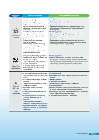 Stakeholder Group Key Considerations Engagement and InteractionGovernment Authorities%u2022 Compliance with high standards of transparency and governance %u2022 Regular communication with relevant government agencies to exchange operational information and reinforce cooperation%u2022 Execution of a robust investment strategy for mutual value creation %u2022 Commitment to exceptional safety performance%u2022 Rapid and efficient response to emergency situation%u2022 Demonstrated aspirations to energy security and transitioning toward lower carbon economy%u2022 Participation in community development and sustainability initiativesPublic Disclosures:%u2022 Website and social media platformsPublic meetings:%u2022 Collaborations with government-associated /governmentaffiliated industry groups, such as Petroleum Institute of Thailand (PTIT)Direct Engagement:%u2022 Communication through Country Manager and Government Affairs teams%u2022 One-on-one meetings%u2022 Collaboration on environmental activities, and community development initiatives with key government entities such as Marine Department and Royal Thai NavyIndustry Peer Organisations%u2022 Compliance with industry regulations and standards, ensuring alignment with industry best practices %u2022 Active participation and contribution in industry-led initiatives %u2022 Knowledge-sharing activities and technical communities for industry advancementsDirect engagement:%u2022 Meetings, seminars and workshops with industry peers%u2022 Knowledge and experience sharing on potential standards for regulatory framework development (including oil spill response preparedness, decommissioning best practices, etc.)Local Communities%u2022 Contribute to community development including infrastructure and educational support %u2022 Partner with other parties to implement initiatives %u2022 Transparent communication on plans and potential impacts %u2022 Proactively address community concerns %u2022 Collaboration initiatives with the local community %u2022 Considering impacts on community livelihood, especially fisheries community%u2022 Transparent communication on operations, plans and potential impacts %u2022 Proactive management and addressing community concerns for a harmonious relationshipPublic Disclosures:%u2022 Website and social media platforms, including local language accounts Direct Engagement:%u2022 Local community meetings%u2022 Special events to foster community engagementStrategic interaction:%u2022 Annual mapping and communications oversight of interactions by country management and government affairs team%u2022 Establishment of a robust grievance mechanism to address and resolve stakeholder concerns effectively%u2022 Corporate social responsibility (CSR) projectsVALEURA ENERGY INC. 113