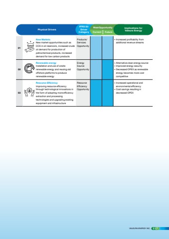 Physical DriversIFRS S2 Driver Category Current Future Implications for Valeura Energy01New Markets New market opportunities such as CCS in oil reservoirs, increased crude oil demand for production of petrochemical products, increased demand for low carbon productsProducts/ Services Opportunity %u2022 Increased profitability from additional revenue streams 02Renewable energy Installation and use of onsite renewable energy and reusing old offshore platforms to produce renewable energy Energy Source Opportunity %u2022 Alternative clean energy source %u2022 Improved energy security %u2022 Decreased OPEX as renewable energy becomes more cost competitive 03Resource Efficiency Improving resource efficiency through technological innovations in the form of adopting more efficiency extraction and processing technologies and upgrading existing equipment and infrastructure Resource Efficiency Opportunity %u2022 Increased operational and environmental efficiency %u2022 Cost savings resulting in decreased OPEX Risk/OpportunityVALEURA ENERGY INC. 117