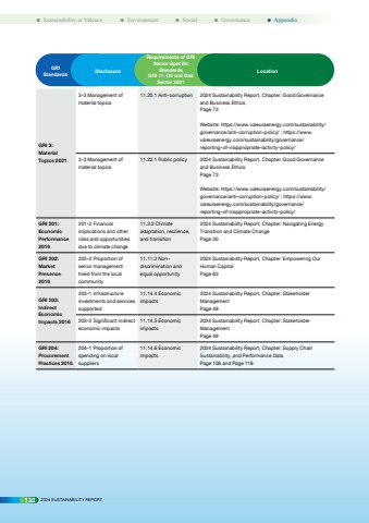 GRI Standards Disclosure Requirements of GRI Sector-Specific StandardsGRI 11: Oil and Gas Sector 2021LocationGRI 3: Material Topics 20213-3 Management of material topics11.20.1 Anti-corruption 2024 Sustainability Report, Chapter: Good Governance and Business EthicsPage 73Website: https://www.valeuraenergy.com/sustainability/governance/anti-corruption-policy/ ; https://www.valeuraenergy.com/sustainability/governance/ reporting-of-inappropriate-activity-policy/3-3 Management of material topics11.22.1 Public policy 2024 Sustainability Report, Chapter: Good Governance and Business EthicsPage 73Website: https://www.valeuraenergy.com/sustainability/governance/anti-corruption-policy/ ; https://www.valeuraenergy.com/sustainability/governance/ reporting-of-inappropriate-activity-policy/GRI 201: Economic Performance 2016201-2 Financial implications and other risks and opportunities due to climate change11.2.2 Climate adaptation, resilience, and transition2024 Sustainability Report, Chapter: Navigating Energy Transition and Climate ChangePage 30GRI 202: Market Presence 2016202-2 Proportion of senior management hired from the local community11.11.2 Nondiscrimination and equal opportunity2024 Sustainability Report, Chapter: Empowering Our Human CapitalPage 63GRI 203: Indirect Economic Impacts 2016203-1 Infrastructure investments and services supported11.14.4 Economic impacts2024 Sustainability Report, Chapter: Stakeholder ManagementPage 49203-2 Significant indirect economic impacts11.14.5 Economic impacts2024 Sustainability Report, Chapter: Stakeholder ManagementPage 49GRI 204: Procurement Practices 2016204-1 Proportion of spending on local suppliers11.14.6 Economic impacts2024 Sustainability Report, Chapter: Supply Chain Sustainability, and Performance DataPage 106 and Page 118132 2024 SUSTAINABILITY REPORT%uf098 Sustainability at Valeura %uf098 Environment %uf098 Social %uf098 Governance %uf098 Appendix