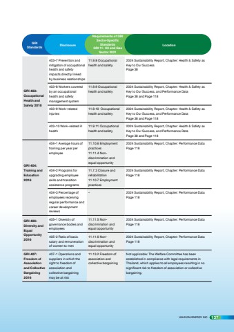 GRI Standards Disclosure Requirements of GRI Sector-Specific StandardsGRI 11: Oil and Gas Sector 2021LocationGRI 403: Occupational Health and Safety 2018 403-7 Prevention and mitigation of occupational health and safety impacts directly linked by business relationships11.9.8 Occupational health and safety2024 Sustainability Report, Chapter: Health & Safety as Key to Our SuccessPage 38403-8 Workers covered by an occupational health and safety management system11.9.9 Occupational health and safety2024 Sustainability Report, Chapter: Health & Safety as Key to Our Success, and Performance DataPage 38 and Page 118403-9 Work-related injuries11.9.10 Occupational health and safety2024 Sustainability Report, Chapter: Health & Safety as Key to Our Success, and Performance DataPage 38 and Page 118403-10 Work-related ill health11.9.11 Occupational health and safety2024 Sustainability Report, Chapter: Health & Safety as Key to Our Success, and Performance DataPage 38 and Page 118GRI 404: Training and Education 2016404-1 Average hours of training per year per employee11.10.6 Employment practices11.11.4 Nondiscrimination and equal opportunity2024 Sustainability Report, Chapter: Performance DataPage 118404-2 Programs for upgrading employee skills and transition assistance programs11.7.3 Closure and rehabilitation11.10.7 Employment practices2024 Sustainability Report, Chapter: Performance DataPage 118404-3 Percentage of employees receiving regular performance and career development reviews- 2024 Sustainability Report, Chapter: Performance DataPage 118GRI 405: Diversity and Equal Opportunity 2016405-1 Diversity of governance bodies and employees11.11.5 Nondiscrimination and equal opportunity2024 Sustainability Report, Chapter: Performance DataPage 118405-2 Ratio of basic salary and remuneration of women to men11.11.6 Nondiscrimination and equal opportunity2024 Sustainability Report, Chapter: Performance DataPage 118GRI 407: Freedom of Association and Collective Bargaining 2016407-1 Operations and suppliers in which the right to freedom of association and collective bargaining may be at risk11.13.2 Freedom of association and collective bargainingNot applicable: The Welfare Committee has been established in compliance with legal requirements in Thailand, which applies to all employees resulting in no significant risk to freedom of association or collective bargaining.VALEURA ENERGY INC. 137