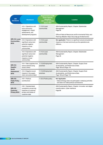 GRI Standards Disclosure Requirements of GRI Sector-Specific StandardsGRI 11: Oil and Gas Sector 2021LocationGRI 413: Local Communities 2016413-1 Operations with local community engagement, impact assessments, and development programs11.15.2 Local communities2024 Sustainability Report, Chapter: Stakeholder Management Page 49Office of Natural Resources and Environmental Policy and Planning Website: https://eia.onep.go.th/site/monitor413-2 Operations with significant actual and potential negative impacts on local communities11.15.3 Local communitiesNot applicable: There is no significant actual and potential impacts on the local community as the operations are offshore.413-2 Operations with significant actual and potential negative impacts on local communities11.15.4 Local communities2024 Sustainability Report, Chapter: Stakeholder ManagementPage 49GRI 414: Supplier Social Assessment 2016414-1 New suppliers that were screened using social criteria11.10.8 Employment practices2024 Sustainability Report, Chapter: Supply Chain Sustainability, and Performance DataPage 106 and Page 118414-2 Negative social impacts in the supply chain and actions taken11.10.9 Employment practices2024 Sustainability Report, Chapter: Supply Chain Sustainability, and Performance DataPage 106 and Page 118GRI 415: Public Policy 2016415-1 Political contributions11.22.2 Public policy Not Applicable:- Valeura Energy does not participate in lobbying activities and does not make political contributions.GRI 418: Customer Privacy 2016418-1 Substantiated complaints concerning breaches of customer privacy and losses of customer data- 2024 Sustainability Report, Chapter: Innovation and digital transformation, Cyber resiliencePage 89138 2024 SUSTAINABILITY REPORT%uf098 Sustainability at Valeura %uf098 Environment %uf098 Social %uf098 Governance %uf098 Appendix