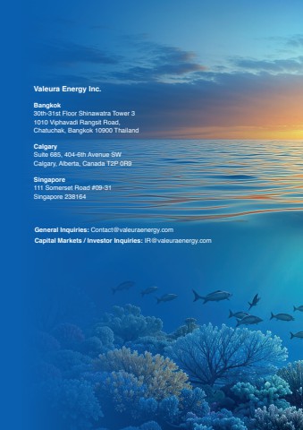 General Inquiries: Contact@valeuraenergy.comCapital Markets / Investor Inquiries: IR@valeuraenergy.comValeura Energy Inc.Bangkok30th-31st Floor Shinawatra Tower 3 1010 Viphavadi Rangsit Road, Chatuchak, Bangkok 10900 ThailandCalgarySuite 685, 404-6th Avenue SWCalgary, Alberta, Canada T2P 0R9Singapore111 Somerset Road #09-31Singapore 238164