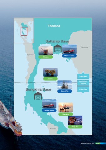 Centralised LogisticsNorth HubSouth HubShared vesselThailandSattahip BaseCambodiaMyanmarMalaysiaManoraJasmineSongkhla BaseShared vesselWassanaNong YaoShared RigVALEURA ENERGY INC. 085
