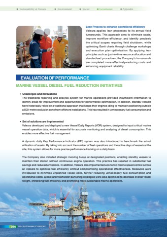 Lean Process to enhance operational efficiencyValeura applies lean processes to its annual field turnarounds. This approach aims to eliminate waste, improve workflow efficiency, and identify precisely the critical scopes requiring field shutdown, while optimising Gantt charts through challenge workshops and execution plan optimisation. By applying lean principles such as just-in-time resource allocation and standardised procedures, the Company%u2019s turnarounds are completed more effectively%u2013reducing costs and enhancing equipment reliability.EVALUATION OF PERFORMANCEMARINE VESSEL DIESEL FUEL REDUCTION INITIATIVES%u2022 Challenges and motivationsThe traditional reporting and analysis system for marine operations provided insufficient information to identify areas for improvement and opportunities for performance optimisation. In addition, standby vessels have historically relied on a traditional approach that keeps their engines idling to maintain positioning outside a 500-metre exclusion zone from offshore installations. This has resulted in unnecessary fuel consumption and emissions.%u2022 Set of solutions are implementedValeura developed and deployed a new Vessel Daily Reports (VDR) system, designed to input critical marine vessel operation data, which is essential for accurate monitoring and analysing of diesel consumption. This enables more effective fuel management.A dynamic daily Key Performance Indicator (KPI) system was also introduced to benchmark the actual utilisation of assets. By taking into account the number of fleet operations and the active days of vessels at the site, this system allows for more precise performance tracking on a daily basis.The Company also installed strategic mooring buoys at designated positions, enabling standby vessels to maintain their station without continuous engine operation. This practice has resulted in substantial fuel savings and reduced emissions. In addition, Valeura also implemented economic marine speed control across all vessels to optimise fuel efficiency without compromising operational effectiveness. Measures were introduced to minimise unplanned vessel calls, further reducing unnecessary fuel consumption and operational costs. Diesel and freshwater bunkering strategies were also optimised to decrease overall vessel weight, enhancing fuel efficiency and promoting more sustainable marine operations.086 2024 SUSTAINABILITY REPORT%uf098 Sustainability at Valeura %uf098 Environment %uf098 Social %uf098 Governance %uf098 Appendix