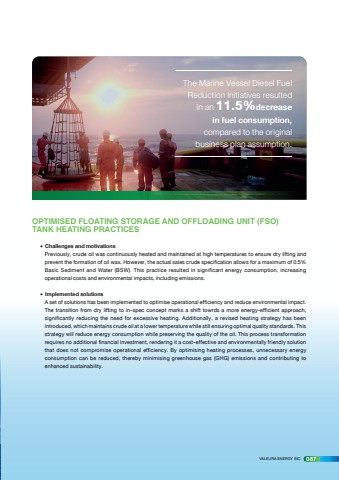 OPTIMISED FLOATING STORAGE AND OFFLOADING UNIT (FSO) TANK HEATING PRACTICES%u2022 Challenges and motivationsPreviously, crude oil was continuously heated and maintained at high temperatures to ensure dry lifting and prevent the formation of oil wax. However, the actual sales crude specification allows for a maximum of 0.5% Basic Sediment and Water (BSW). This practice resulted in significant energy consumption, increasing operational costs and environmental impacts, including emissions.%u2022 Implemented solutionsA set of solutions has been implemented to optimise operational efficiency and reduce environmental impact. The transition from dry lifting to in-spec concept marks a shift towrds a more energy-efficient approach, significantly reducing the need for excessive heating. Additionally, a revised heating strategy has been introduced, which maintains crude oil at a lower temperature while still ensuring optimal quality standards. This strategy will reduce energy consumption while preserving the quality of the oil. This process transformation requires no additional financial investment, rendering it a cost-effective and environmentally friendly solution that does not compromise operational efficiency. By optimising heating processes, unnecessary energy consumption can be reduced, thereby minimising greenhouse gas (GHG) emissions and contributing to enhanced sustainability.The Marine Vessel Diesel Fuel Reduction Initiatives resulted in an 11.5%decrease in fuel consumption, compared to the original business plan assumption.VALEURA ENERGY INC. 087