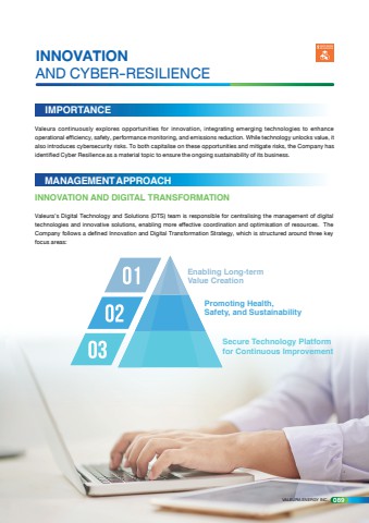 INNOVATION AND CYBER-RESILIENCEMANAGEMENT APPROACHIMPORTANCEValeura continuously explores opportunities for innovation, integrating emerging technologies to enhance operational efficiency, safety, performance monitoring, and emissions reduction. While technology unlocks value, it also introduces cybersecurity risks. To both capitalise on these opportunities and mitigate risks, the Company has identified Cyber Resilience as a material topic to ensure the ongoing sustainability of its business. INNOVATION AND DIGITAL TRANSFORMATIONValeura%u2019s Digital Technology and Solutions (DTS) team is responsible for centralising the management of digital technologies and innovative solutions, enabling more effective coordination and optimisation of resources. The Company follows a defined Innovation and Digital Transformation Strategy, which is structured around three key focus areas:Secure Technology Platform for Continuous ImprovementEnabling Long-term Value CreationPromoting Health, Safety, and SustainabilityVALEURA ENERGY INC. 089