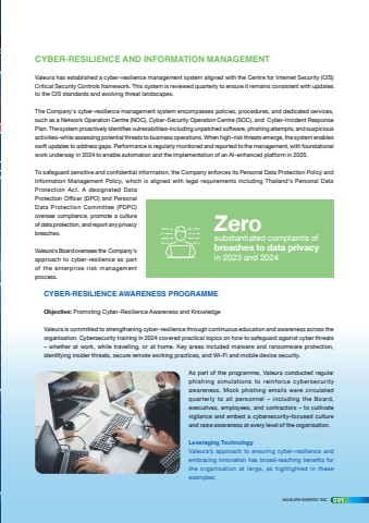CYBER-RESILIENCE AND INFORMATION MANAGEMENTValeura has established a cyber-resilience management system aligned with the Centre for Internet Security (CIS) Critical Security Controls framework. This system is reviewed quarterly to ensure it remains consistent with updates to the CIS standards and evolving threat landscapes. The Company%u2019s cyber-resilience management system encompasses policies, procedures, and dedicated services, such as a Network Operation Centre (NOC), Cyber-Security Operation Centre (SOC), and Cyber-Incident Response Plan. The system proactively identifies vulnerabilities-including unpatched software, phishing attempts, and suspicious activities-while assessing potential threats to business operations. When high-risk threats emerge, the system enables swift updates to address gaps. Performance is regularly monitored and reported to the management, with foundational work underway in 2024 to enable automation and the implementation of an AI-enhanced platform in 2025.To safeguard sensitive and confidential information, the Company enforces its Personal Data Protection Policy and Information Management Policy, which is aligned with legal requirements including Thailand%u2019s Personal Data Protection Act. A designated Data Protection Officer (DPO) and Personal Data Protection Committee (PDPC) oversee compliance, promote a culture of data protection, and report any privacy breaches.Valeura%u2019s Board oversees the Company%u2019s approach to cyber-resilience as part of the enterprise risk management process.CYBER-RESILIENCE AWARENESS PROGRAMMEObjective: Promoting Cyber-Resilience Awareness and KnowledgeValeura is committed to strengthening cyber-resilience through continuous education and awareness across the organisation. Cybersecurity training in 2024 covered practical topics on how to safeguard against cyber threats %u2013 whether at work, while travelling, or at home. Key areas included malware and ransomware protection, identifying insider threats, secure remote working practices, and Wi-Fi and mobile device security.As part of the programme, Valeura conducted regular phishing simulations to reinforce cybersecurity awareness. Mock phishing emails were circulated quarterly to all personnel %u2013 including the Board, executives, employees, and contractors %u2013 to cultivate vigilance and embed a cybersecurity-focused culture and raise awareness at every level of the organisation.Leveraging TechnologyValeura%u2019s approach to ensuring cyber-resilience and embracing innovation has broad-reaching benefits for the organisation at large, as highlighted in these examples:Zerosubstantiated complaints of breaches to data privacyin 2023 and 2024VALEURA ENERGY INC. 091