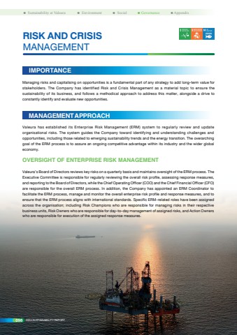 RISK AND CRISIS MANAGEMENTMANAGEMENT APPROACHIMPORTANCEManaging risks and capitalising on opportunities is a fundamental part of any strategy to add long-term value for stakeholders. The Company has identified Risk and Crisis Management as a material topic to ensure the sustainability of its business, and follows a methodical approach to address this matter, alongside a drive to constantly identify and evaluate new opportunities.Valeura has established its Enterprise Risk Management (ERM) system to regularly review and update organisational risks. The system guides the Company toward identifying and understanding challenges and opportunities, including those related to emerging sustainability trends and the energy transition. The overarching goal of the ERM process is to assure an ongoing competitive advantage within its industry and the wider global economy. OVERSIGHT OF ENTERPRISE RISK MANAGEMENTValeura%u2019s Board of Directors reviews key risks on a quarterly basis and maintains oversight of the ERM process. The Executive Committee is responsible for regularly reviewing the overall risk profile, assessing response measures, and reporting to the Board of Directors, while the Chief Operating Officer (COO) and the Chief Financial Officer (CFO) are responsible for the overall ERM process. In addition, the Company has appointed an ERM Coordinator to facilitate the ERM process, manage and monitor the overall enterprise risk profile and response measures, and to ensure that the ERM process aligns with international standards. Specific ERM-related roles have been assigned across the organisation; including Risk Champions who are responsible for managing risks in their respective business units, Risk Owners who are responsible for day-to-day management of assigned risks, and Action Owners who are responsible for execution of the assigned response measures.098 2024 SUSTAINABILITY REPORT%uf098 Sustainability at Valeura %uf098 Environment %uf098 Social %uf098 Governance %uf098 Appendix